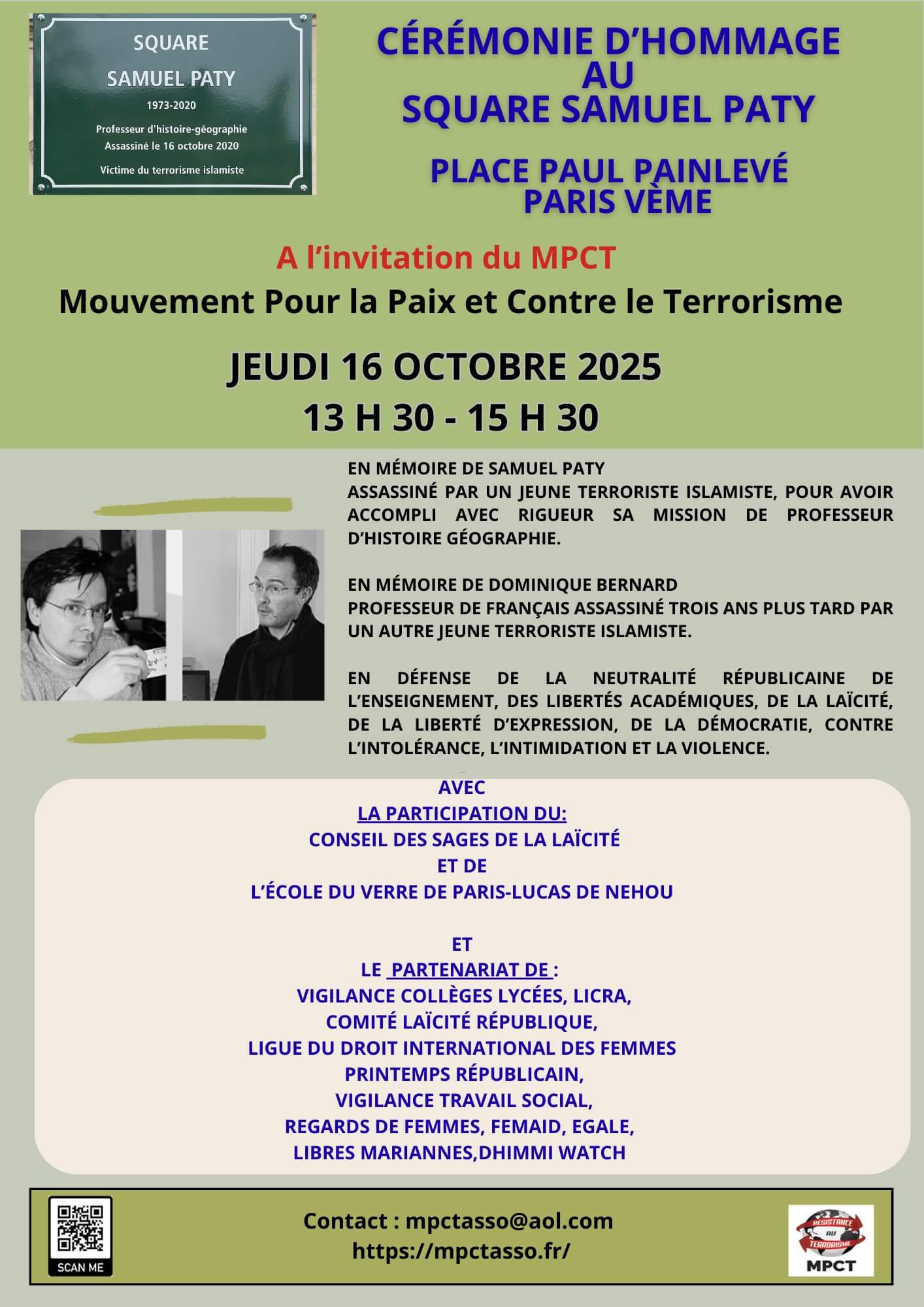 Le jeudi 16 octobre à 13 h 30, le MPCT organise, avec plusieurs associations, une cérémonie d’hommage au square Samuel Paty, lieu symbolique qui célèbre sa mémoire au coeur de Paris, face à la Sorbonne. Cette année, deux instances institutionnelles nous font l’honneur d’y participer : le Lycée Lucas de Nehou, ses élèves post-bac réalisant