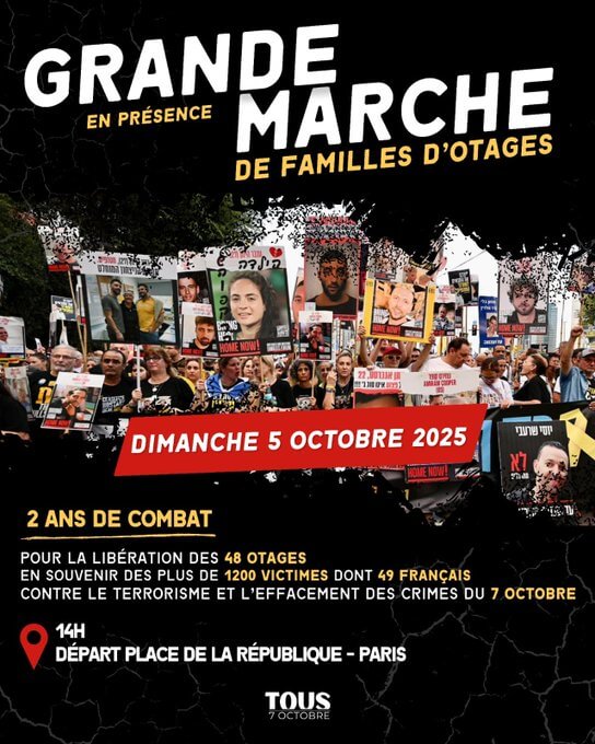 Parce que la solidarité inconditionnelle avec les otages israéliens doit s’exprimer dans la rue, le MPCT participera dimanche 5 octobre à la marche organisée à Paris par le Collectif Tous 7 octobre. Stop à la torture des otages israéliens humiliés, affamés, exhibés par le Hamas dans l’indifférence du monde ! Enfin, une pression politique s’exerce