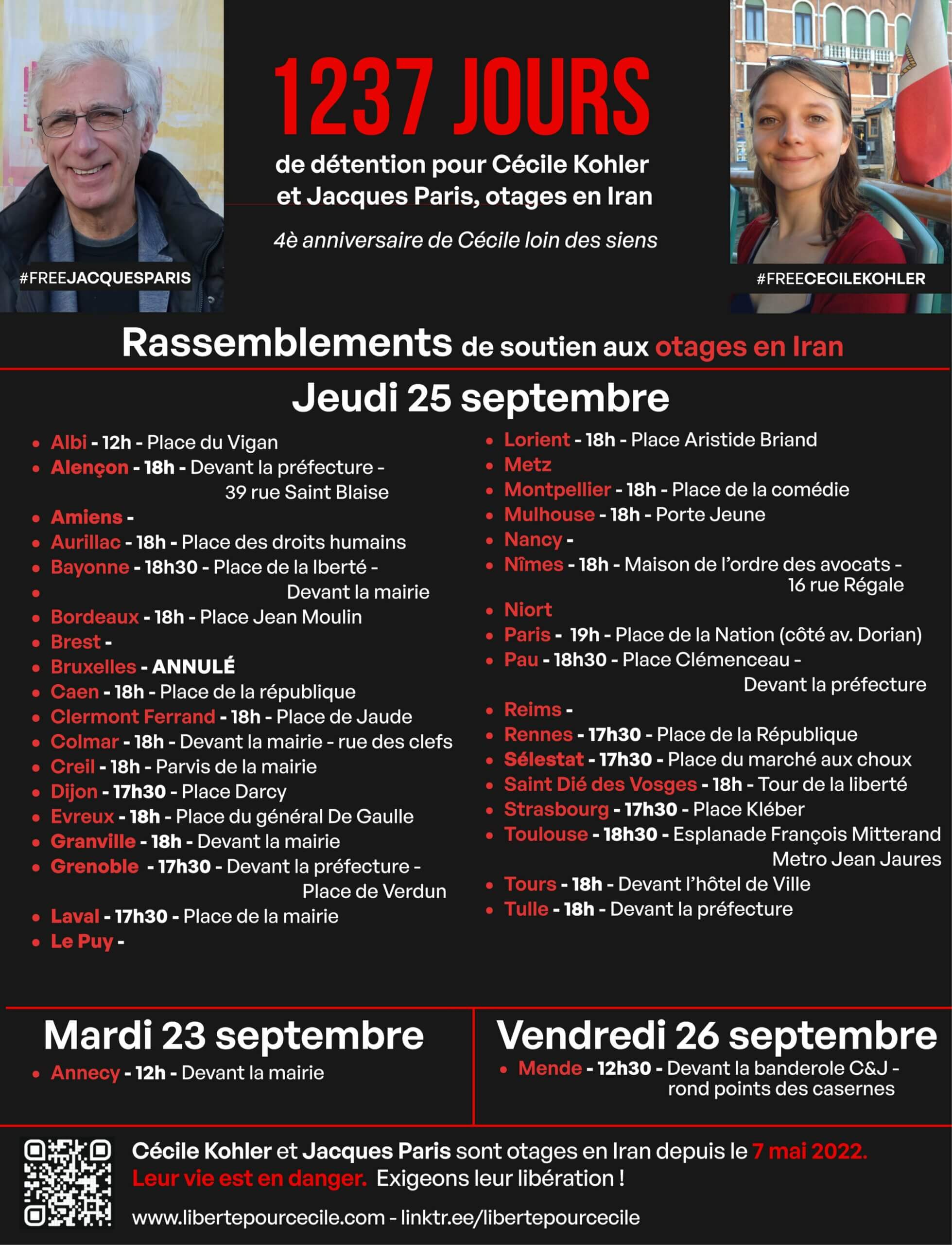 Ce 25 septembre marquera le 4ème anniversaire qu’une jeune enseignante française prénommée Cécile passera en prison. Pourquoi ? Pour rien, parce que la République Islamique d’Iran pratique avec succès la diplomatie des otages. Arracher sa libération, celle de Jacques Paris et du Dr Ahmadreza Djalali (Binational suédo-iranien, otage depuis 9 ans et condamné à mort)